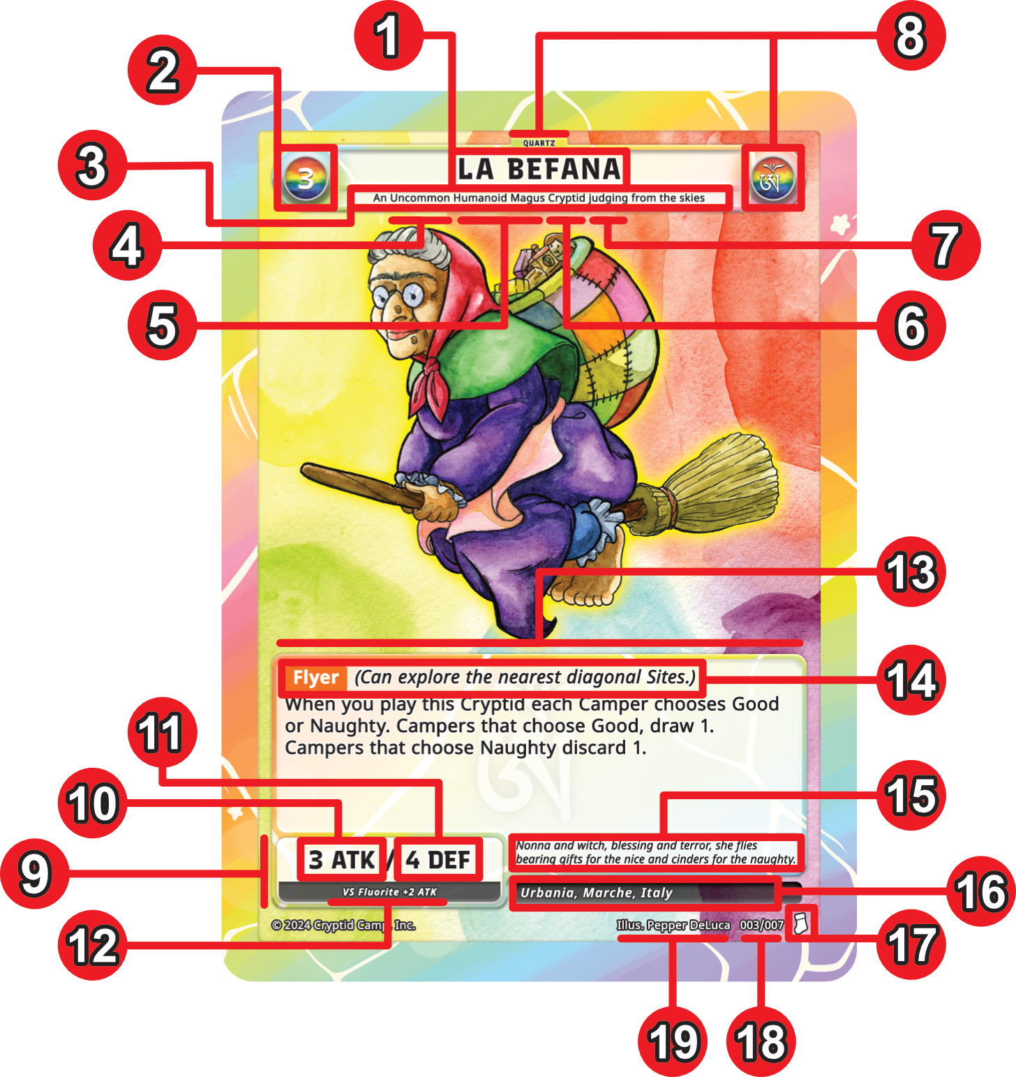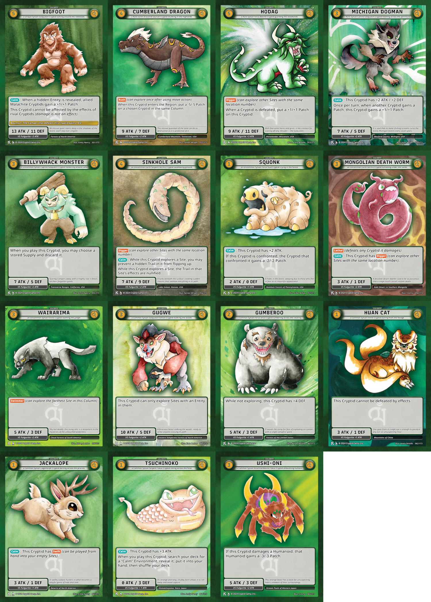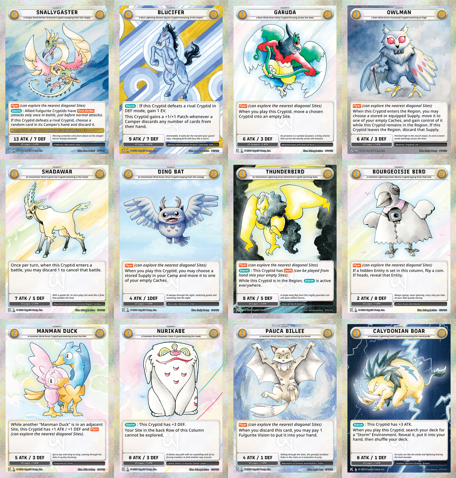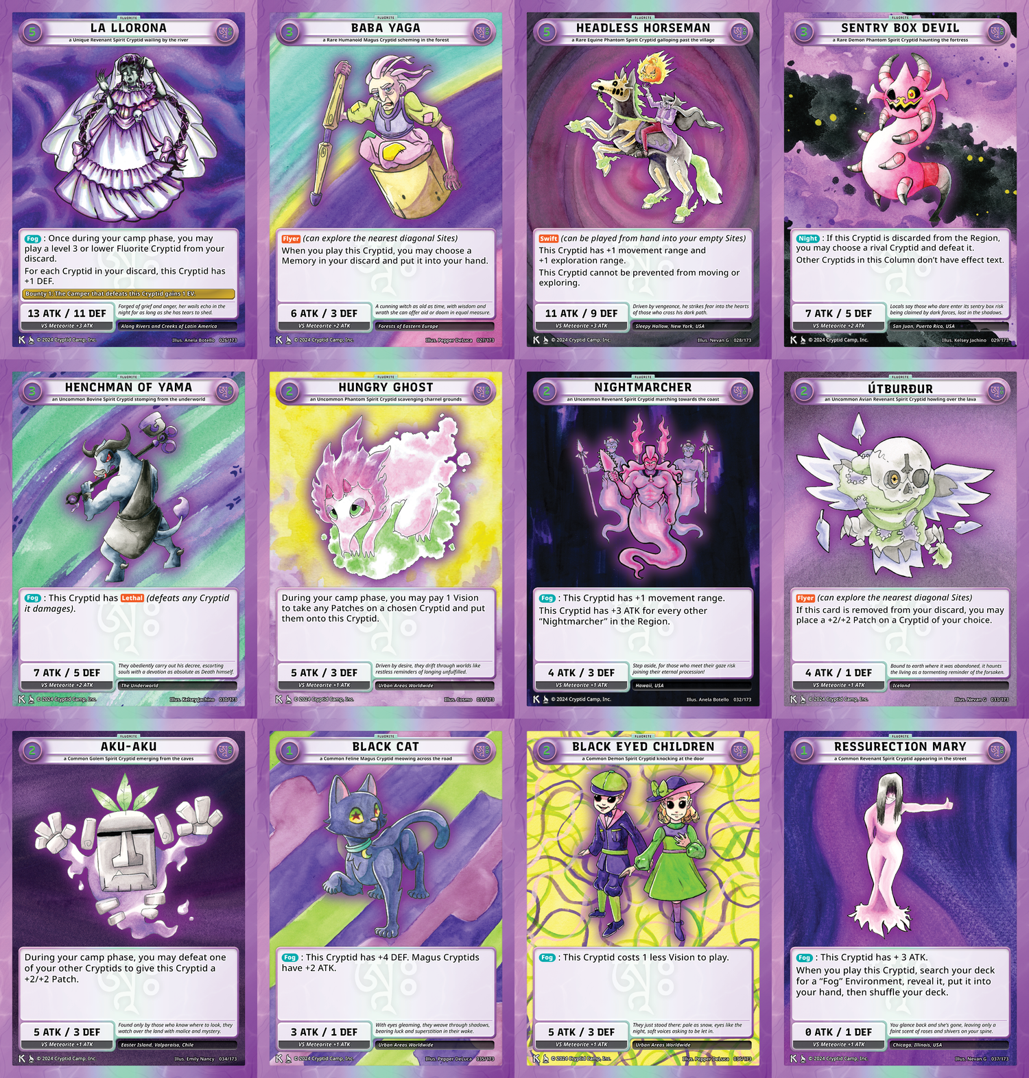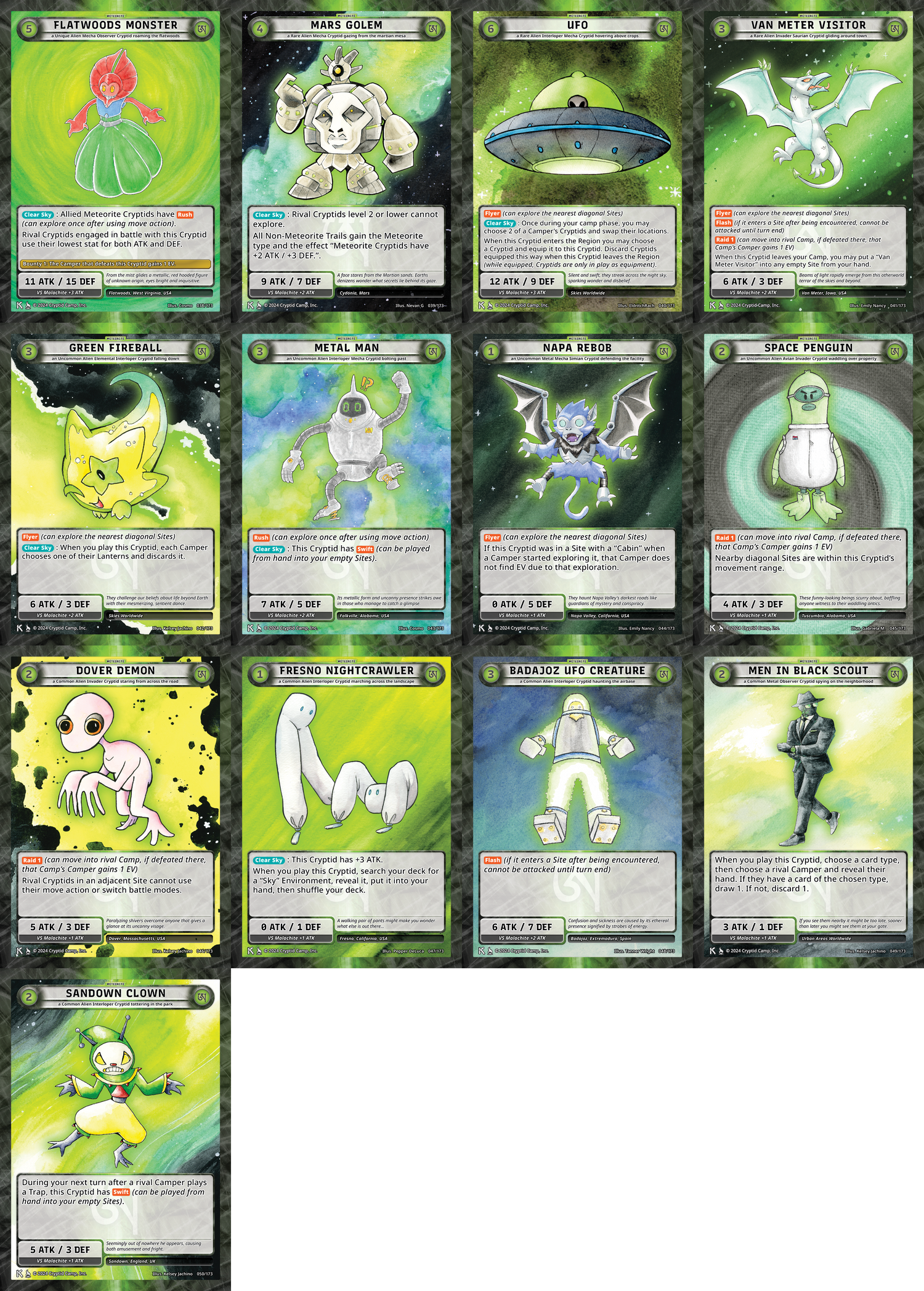 Welcome to the Cryptid Camp card collection! Each card is a portal to the mysterious world of cryptids and the people who study them. With stunning artwork, unique abilities, and strategic gameplay, the cards in Cryptid Camp bring legends to life and let you create your own cryptid adventure.