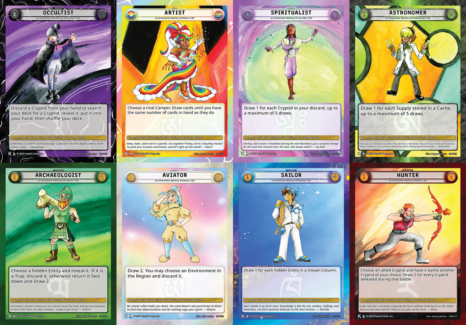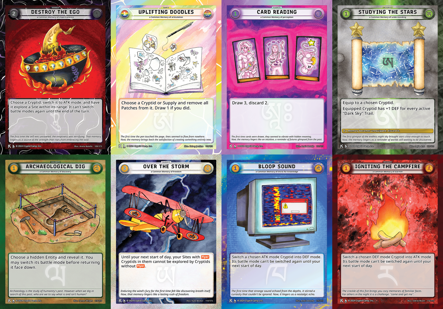 In Cryptid Camp, Memories bring the thrill of the unexpected to every game. These versatile cards deliver immediate effects that can turn the tide of any encounter. Whether you’re strategizing with your Cryptozoologists (CZOs), altering the battlefield with Environments, or giving your Cryptids a critical edge, Memories provide endless possibilities for dynamic gameplay.
