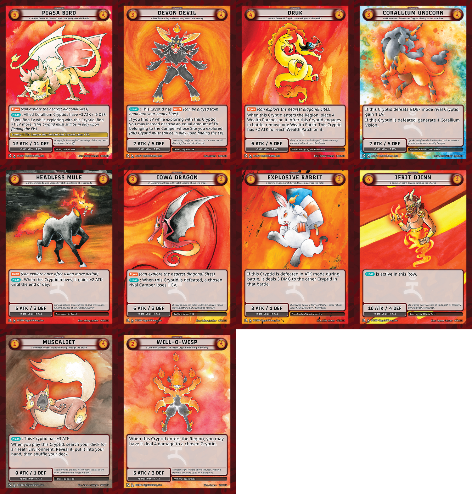 Gameplay: Corallium Campers focus on battle, favoring a fast and strong offense at the expense of defense. Corallium Cryptids bring the heat, empowering their attacks and spreading damage throughout the Region. These Campers are willing to take risks to burn down obstacles and quickly accumulate Evidence. In the worst-case scenario, if they go down, they’ll take their rivals with them.