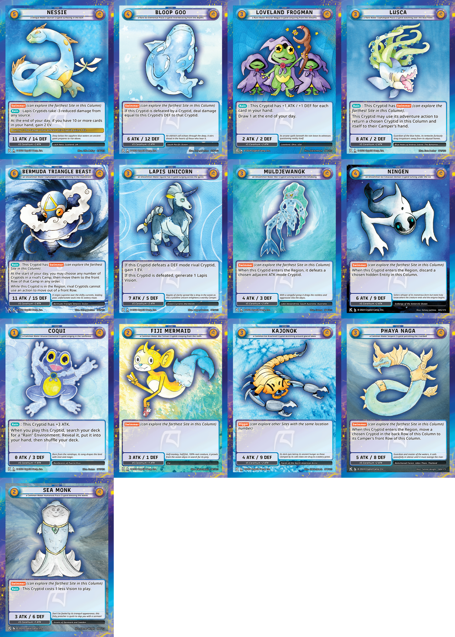 Gameplay: Lapis Campers harness the flexibility of water while remaining steadfast like determined ice, snow, and rain. Lapis Cryptids defend against onslaughts, while Swimmers navigate the waters to explore the farthest reaches of the Region. Resourceful Lapis Campers accumulate cards and Evidence in ways others cannot, all while inhibiting their rivals' attempts to navigate their flow.